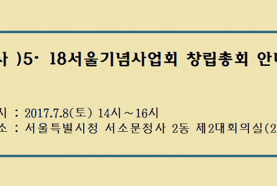 오는 7월 8일(토)에 서울특별시청 서소문청사 2동 2층 제2대회의실에서 ‘(사)5.18서울기념사업회’ 창립 총회를 개최하오니,