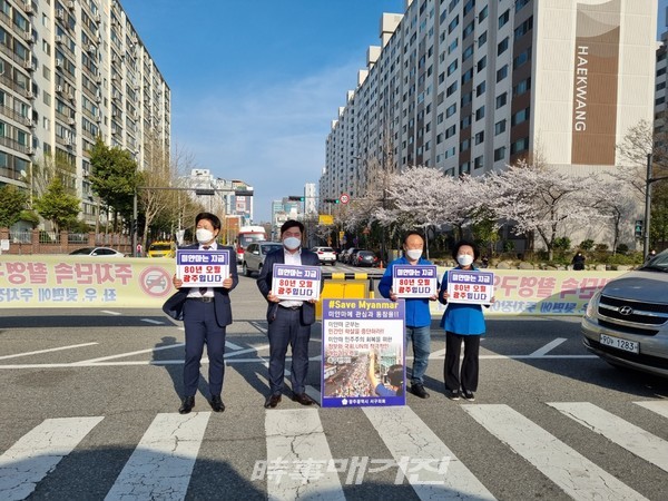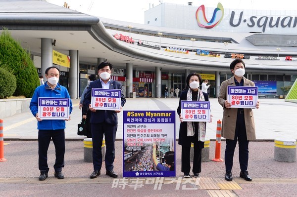 [시사매거진/광주전남] 광주서구의회 민주당 소속 의원들이 지난 3월 24일부터 26일까지 3일간 최근 관내 인구 밀집지역에서 미얀마 군부 쿠데타로 민간인 탄압과 학살이 자행되고 있는 현지 상황을 규탄하며 시위에 나섰다.