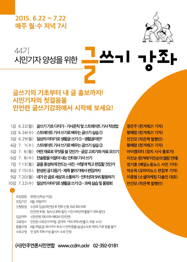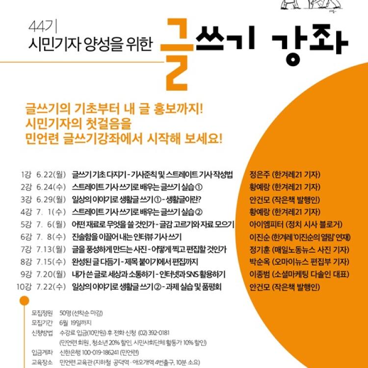 By admin on 화, 05/12/2015 - 17:00 공지사항 시민기자 양성을 위한 <44기 글쓰기 강좌> 민주언론시민연합은 글쓰기에 관심 있는 시민들을 대상으로 오는 6월 22일부터 시민기자 양성을 위한 <44기 글쓰기 강좌>를 개최합니다.