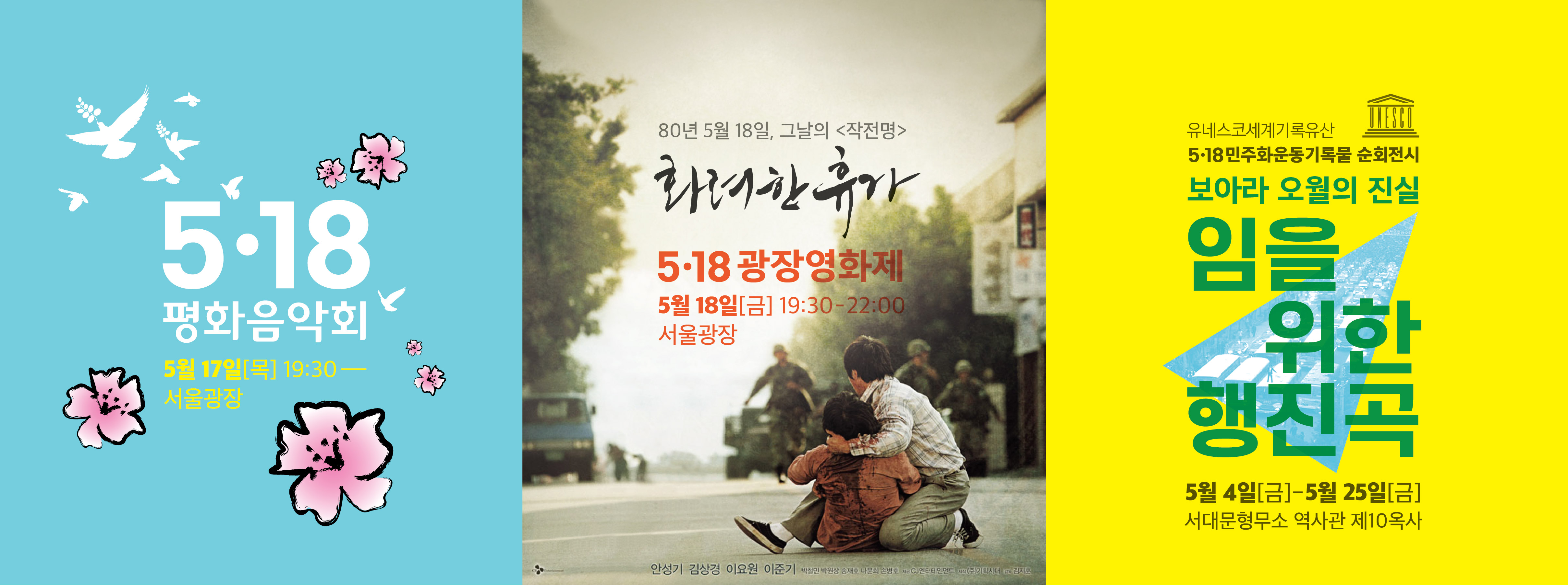 - 5•18평화음악회 일시: 2018년 5월 17일(목) 19:30~ 장소: 서울광장 - 5•18광장영화제 일시: 2018년 5월 18일(금) 19:30~22:00 장소: 서울광장 -유네스코 기록유산 5•18민주화운동기록물 순회전시 보아라 오월의 진실 '임을 위한 행진곡' 일시: 2018년 5월 4일(금)~5월 25일(금) 장소: 서대문형무소 역사관 제 10옥사 공지사항 프로젝트명 5.18민주화운동 서울행사 로그인 또는 등록하여 주석 게시 518seoul 3월 28, 2018 1min read A- A+ facebook twitter envelope print