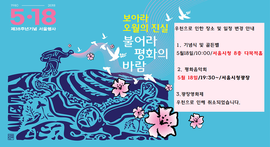 5·18민중항쟁 제38주년기념 서울행사 우천으로 인한 장소 및 일정 변경 안내 1. 기념식 및 골든벨 5월18일/10:00/서울광장->5월18일/10:00/서울시청 8층 다목적홀 2. 평화음악회 5월17일/19:30/서울광장 ->5월18일/19:30/서울광장으로 변경 3. 광장영화제 5월 18일/19:30 -> 우천으로 인하여 취소되었습니다. 공지사항 프로젝트명 5.18민주화운동 서울행사 로그인 또는 등록하여 주석 게시 518seoul 5월 16, 2018 1min read A- A+ facebook twitter envelope print