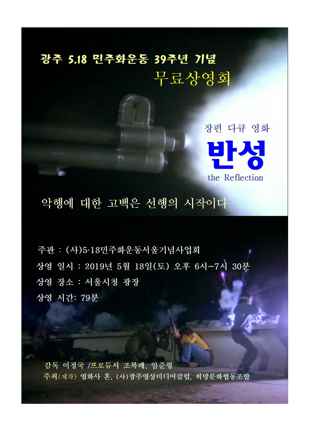 5·18민주화운동 39주년 기념 무료상영회 '장편다큐영화_반성' 상영시간: 2019년 5월 18일(토) 오후6시~7시 30분 상영장소: 서울시청 광장 상영시간: 79분 감독 이정국 / 프로듀서 조복례, 임준형 제작 영화사 혼, (사)광주영상미디어클럽, 희망문화협동조합 공지사항 프로젝트명 5.18 기념공연 로그인 또는 등록하여 주석 게시 518seoul 5월 10, 2019 1min read A- A+ facebook twitter envelope print