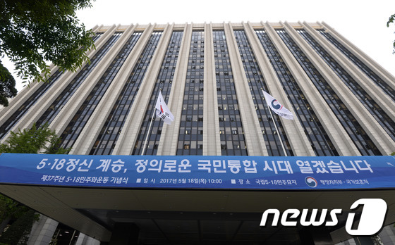 (서울=뉴스1) 안은나 기자 = 제37주년 5.18 민주화 운동 기념일을 하루 앞둔 17일 서울 세종로 정부서울청사에 '5.18 정신 계승, 정의로운 국민통합 시대 열겠습니다'라고 적힌 기념식 안내 현수막이 걸려 있다. 2017.5.18/뉴스1 [email protected]