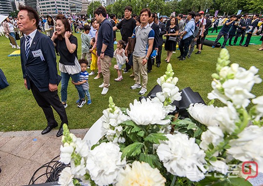 [일요신문] 18일 오전 서울 중구 서울광장에서 열린 제39주년 5.18민주화운동 서울 기념식에서 내빈과 참석자들이 헌화 및 분향을 하기 위해 줄서고 있다. / 최준필 기자 [email protected]