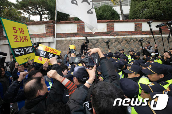 (서울=뉴스1) 이승배 기자 = 5.18민주유공자유족회를 비롯한 피해자 등 관련 단체원들이 12일 오후 서울 서대문구 전두환 전 대통령 자택 앞에서 5.18 진상규명 및 책임자 처벌, 전 전 대통령의 적극적인 추징금 추징, 역사왜곡처벌법 제정 등을 촉구하며 경찰과 충돌을 빚고 있다. 2019.11.12/뉴스1 [email protected]