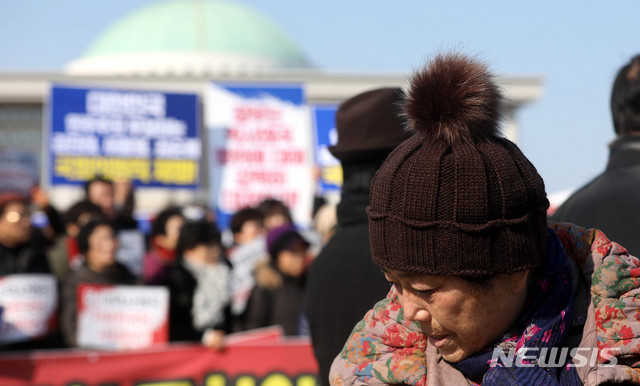 【서울=뉴시스】추상철 기자 = 5.18 기념재단을 비롯한 관련 단체의 5.18과 관련 비판적 발언을 한 국회의원 제명과 자유한국당 해체 등을 촉구하는 상경시위를 벌인 13일 오후 서울 영등포구 여의도 국회의사당 앞에서 참가자가 고개를 떨구고 있다. 2019.02.13.