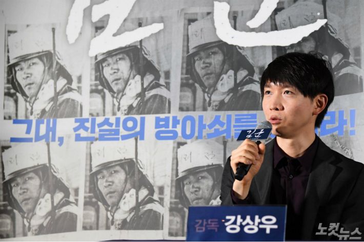 강상우 감독이 13일 오전 서울 광진구 롯데시네마 건대입구점에서 열린 5.18 시민군의 행방을 쫓는 내용의 다큐멘터리 영화 ‘김군’ 언론시사회에 참석해 취재진의 질문에 답하고 있다. 영화 속 김군은 누군가는 한 동네 살았던 사람으로 기억하고, 지만원 씨는 북한군 ‘제1광수’ 로 지적한 인물이다. (사진=황진환 기자)