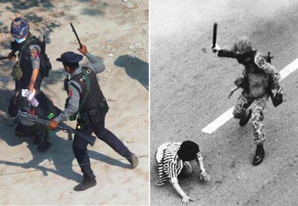 시공을 초월해 비슷한 장면으로 겹쳐진 두 장의 사진처럼, 미얀마 사태와 5·18광주민주화운동은 그 출발과 진행과정이 비슷하다. 미얀마 군부는 지난달 '총선 조작'을 이유로 쿠데타를 일으켰고, 이후 시민들의 반 쿠데타, 민주화 촉구 시위가 한 달 이상 이어 오고 있다. 5·18 역시 1979년 '12·12군사반란'으로 권력을 잡은 신군부가 이에 항거하는 학생 시민을 억압하는 과정에서 발생했다.