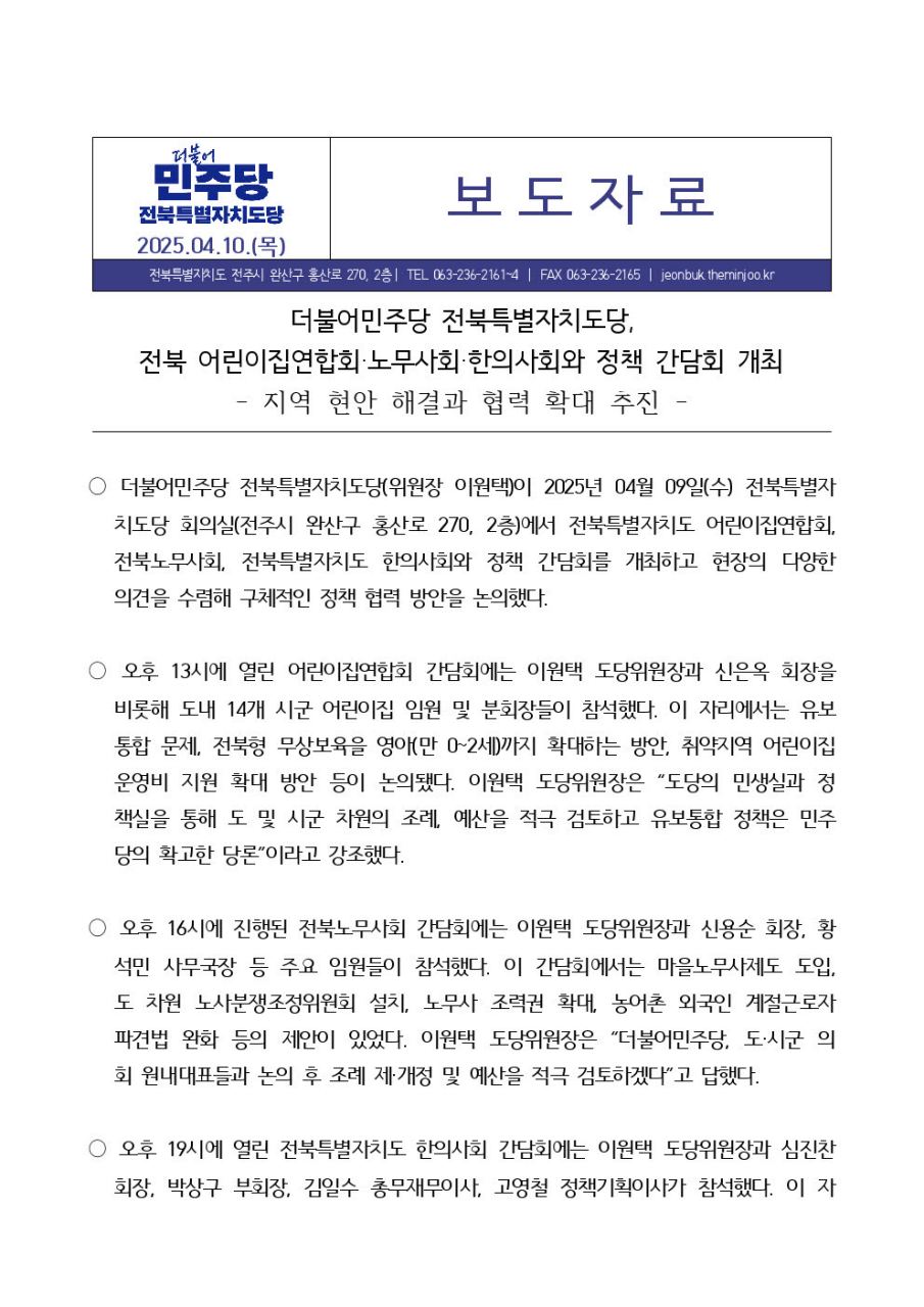 목, 2025/04/10- 00:00 에 admin 에 의해 제출됨 [0] 관련 개인/그룹 민주당 전북도당 정당 더불어민주당 지역 전북 카테고리 보도자료 250410_보도자료_전북어린이집연합회·노무사회·한의사회_간담회_v1.0.hwp13시어린이집 간담회사진1.jpg16시노무사회간담회 사진.jpg19시한의사회간담회 사진1.jpg 링크 https://jeonbuk.theminjoo.kr/party/sub/news/view.php?brd=249&post=1633&board_id=press Like 0 Dislike 0 댓글 달기 이름 제목 Comment 저장 Preview