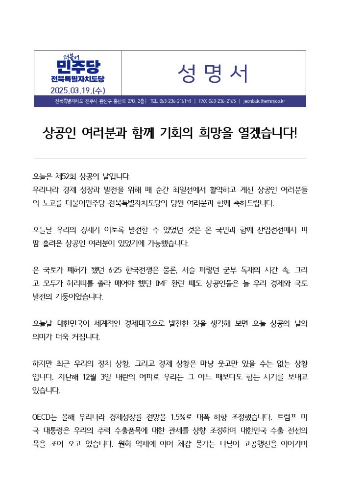 수, 2025/03/19- 00:00 에 admin 에 의해 제출됨 [0] 관련 개인/그룹 민주당 전북도당 정당 더불어민주당 지역 전북 카테고리 보도자료·성명·논평 전자점자 내려받기 점자뷰어 보기25.03.19_성명서_제52회_상공의날_축하_fn.hwp 링크 https://jeonbuk.theminjoo.kr/party/sub/news/view.php?brd=60&post=1605&board_id=briefing Like 0 Dislike 0 댓글 달기 이름 제목 Comment 저장 Preview