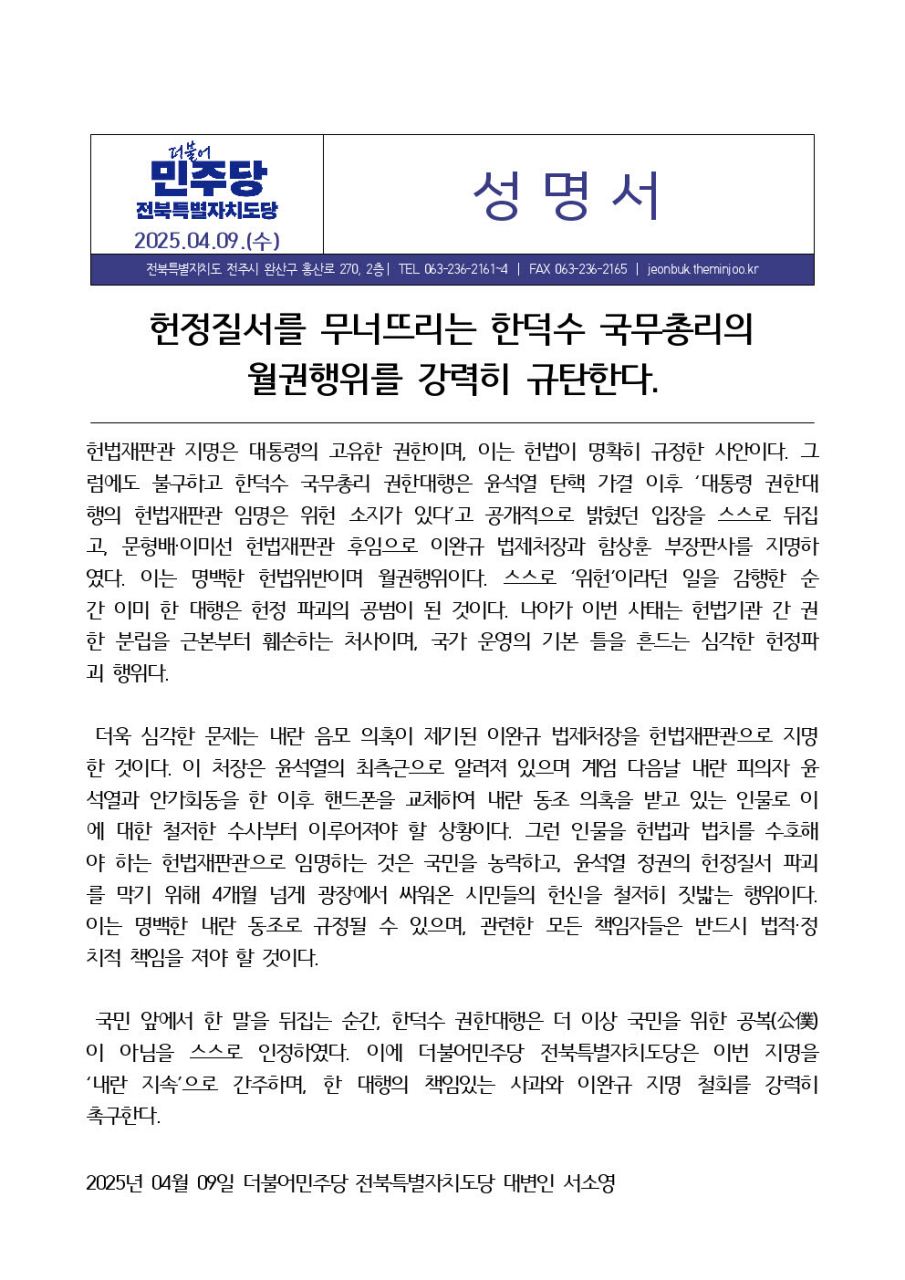 수, 2025/04/09- 00:00 에 admin 에 의해 제출됨 [0] 관련 개인/그룹 민주당 전북도당 정당 더불어민주당 지역 전북 카테고리 보도자료·성명·논평 250409_성명서_한덕수_헌법재판관_지명_규탄_성명서_v1.0.hwp서소영대변인사진.jpg 링크 https://jeonbuk.theminjoo.kr/party/sub/news/view.php?brd=60&post=1629&board_id=briefing Like 0 Dislike 0 댓글 달기 이름 제목 Comment 저장 Preview