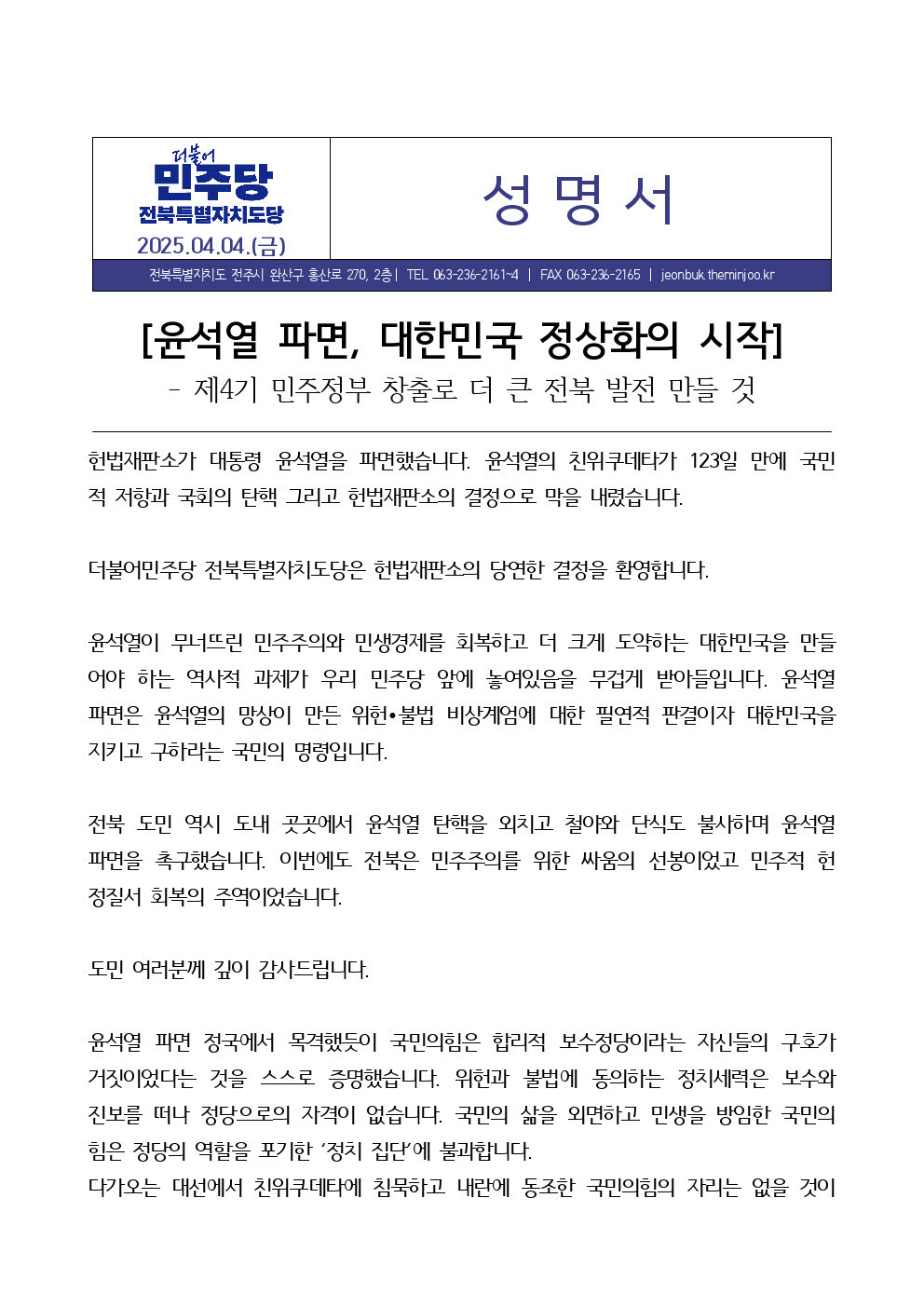 금, 2025/04/04- 00:00 에 admin 에 의해 제출됨 [0] 관련 개인/그룹 민주당 전북도당 정당 더불어민주당 지역 전북 카테고리 보도자료·성명·논평 250404_성명서_윤석열_탄핵_인용_관련_v1_0.hwp 링크 https://jeonbuk.theminjoo.kr/party/sub/news/view.php?brd=60&post=1623&board_id=briefing Like 0 Dislike 0 댓글 달기 이름 제목 Comment 저장 Preview