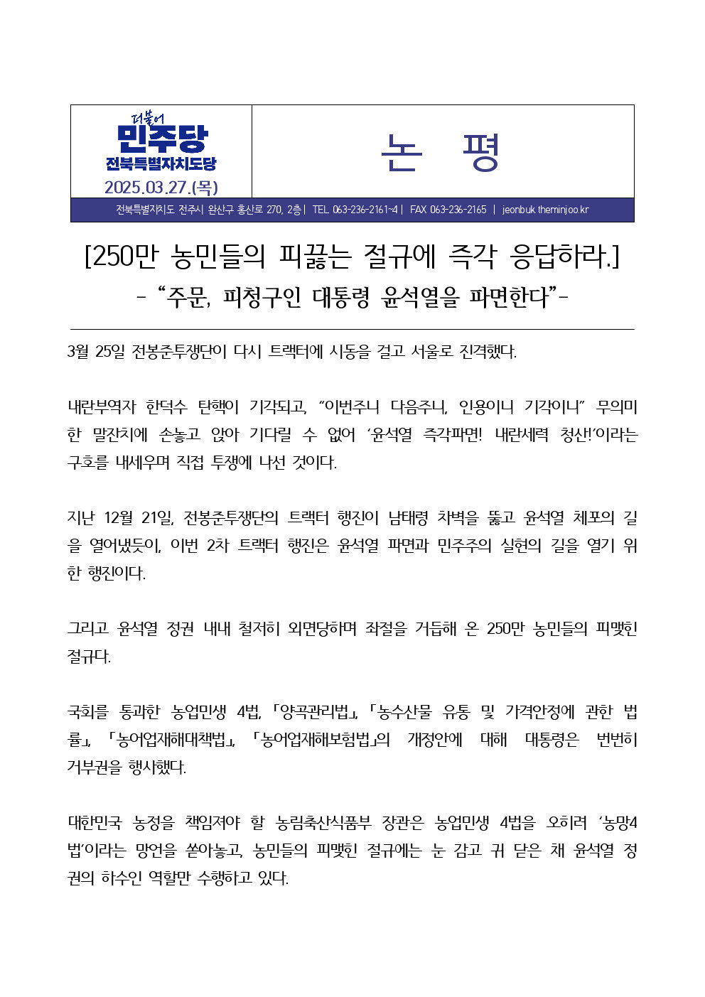 목, 2025/03/27- 00:00 에 admin 에 의해 제출됨 [0] 관련 개인/그룹 민주당 전북도당 정당 더불어민주당 지역 전북 카테고리 보도자료·성명·논평 25.03.27[논평]윤석열_즉각_파면_대변인 권요안.hwp 링크 https://jeonbuk.theminjoo.kr/party/sub/news/view.php?brd=60&post=1614&board_id=briefing Like 0 Dislike 0 댓글 달기 이름 제목 Comment 저장 Preview