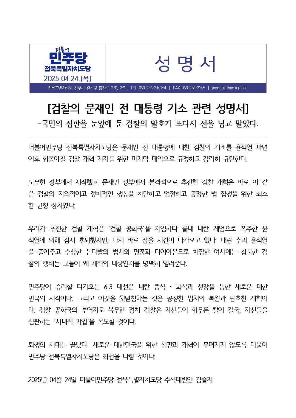 목, 2025/04/24- 00:00 에 admin 에 의해 제출됨 [0] 관련 개인/그룹 민주당 전북도당 정당 더불어민주당 지역 전북 카테고리 보도자료·성명·논평 250424_성명서_검찰_문재인_전대통령_기소_관련_v1.0.hwp 링크 https://jeonbuk.theminjoo.kr/party/sub/news/view.php?brd=60&post=1674&board_id=briefing Like 0 Dislike 0 댓글 달기 이름 제목 Comment 저장 Preview