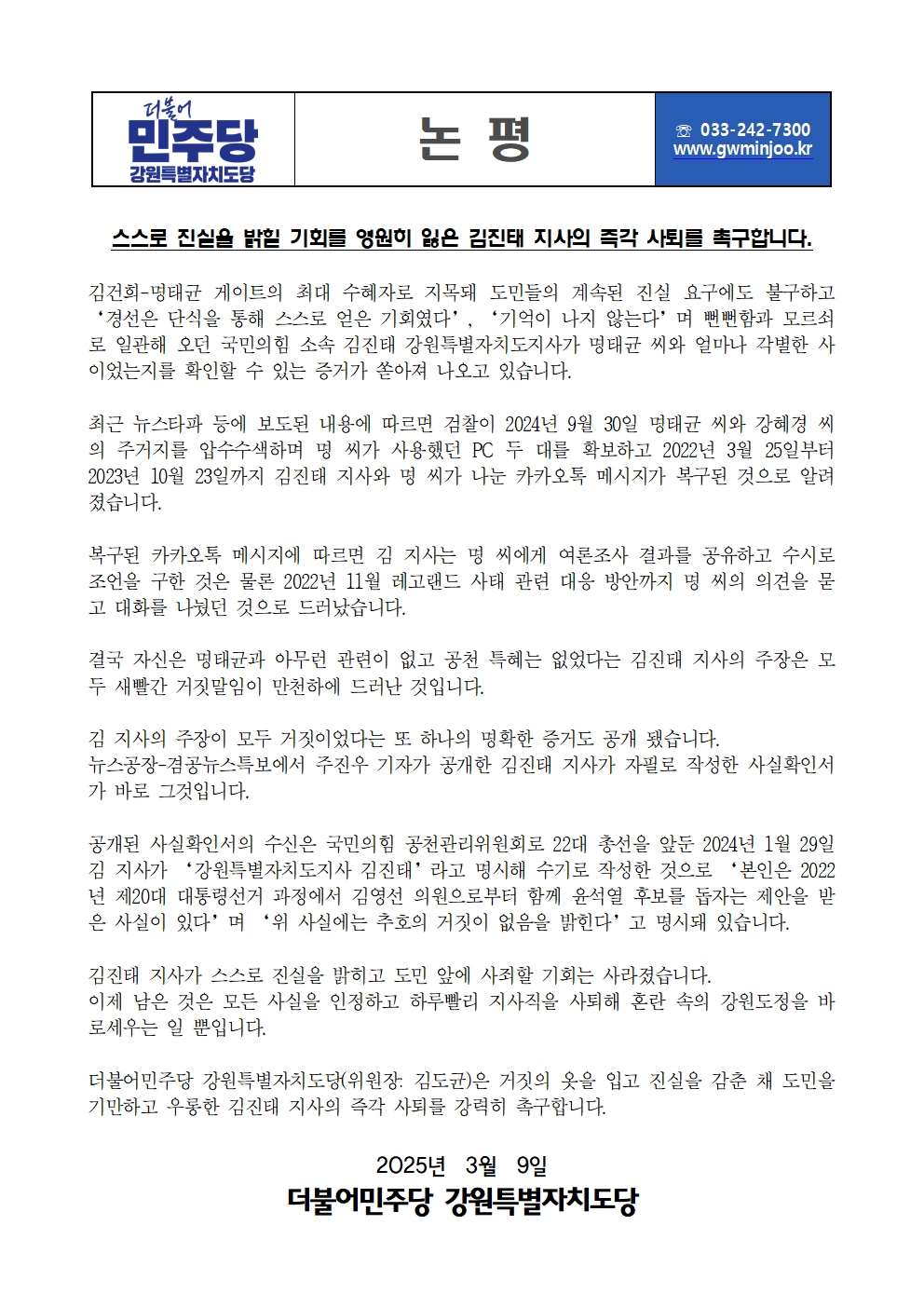 일, 2025/03/09- 00:00 에 admin 에 의해 제출됨 [0] 관련 개인/그룹 민주당 강원도당 정당 더불어민주당 지역 강원 카테고리 보도자료·성명·논평 링크 https://www.gwminjoo.kr/portal/F20000/F20300/boardView?board_key=3105&page=1 Like 0 Dislike 0 댓글 달기 이름 제목 Comment 저장 Preview