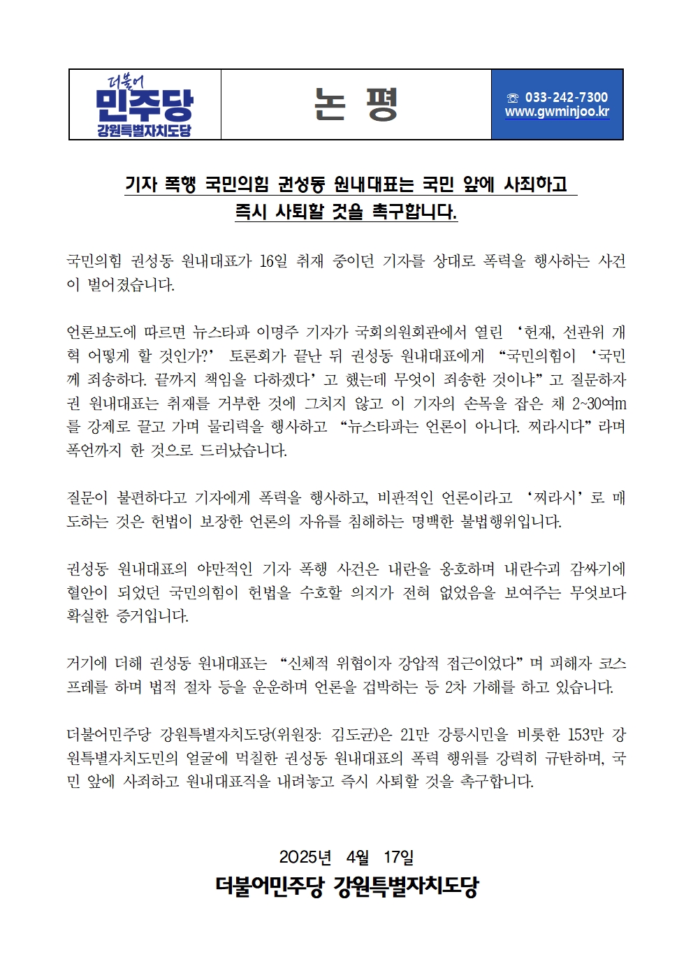 목, 2025/04/17- 00:00 에 admin 에 의해 제출됨 [0] 관련 개인/그룹 민주당 강원도당 정당 더불어민주당 지역 강원 카테고리 보도자료·성명·논평 링크 https://www.gwminjoo.kr/portal/F20000/F20300/boardView?board_key=3206&page=1 Like 0 Dislike 0 댓글 달기 이름 제목 Comment 저장 Preview