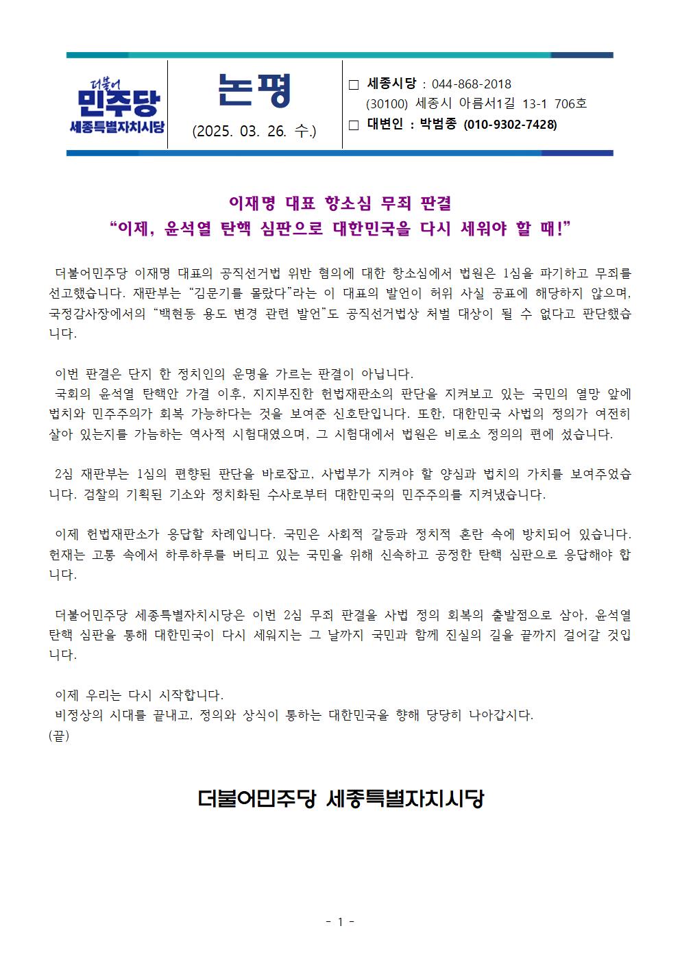 수, 2025/03/26- 00:00 에 admin 에 의해 제출됨 [0] 관련 개인/그룹 민주당 세종시당 정당 더불어민주당 지역 세종 카테고리 논평브리핑 정무직 당직 신청서 양식.hwp(논평)이재명 대표 항소심 무죄 판결.pdf 링크 https://sejong.theminjoo.kr/party/sub/news/view.php?brd=54&post=907&board_id=briefing Like 0 Dislike 0 댓글 달기 이름 제목 Comment 저장 Preview