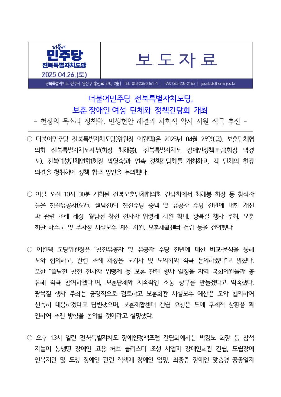 20250426_보도자료_전북보훈단체협의회_전북특별자치도장애인정책포럼_전북여성단체연합_간담회v1.0.hwp보훈단체협의회 전북특별자치도지부 간담회 3.jpg전북특별자치도 장애인정책포럼 간담회1.jpg전북여성단체연합회 간담회2.jpg