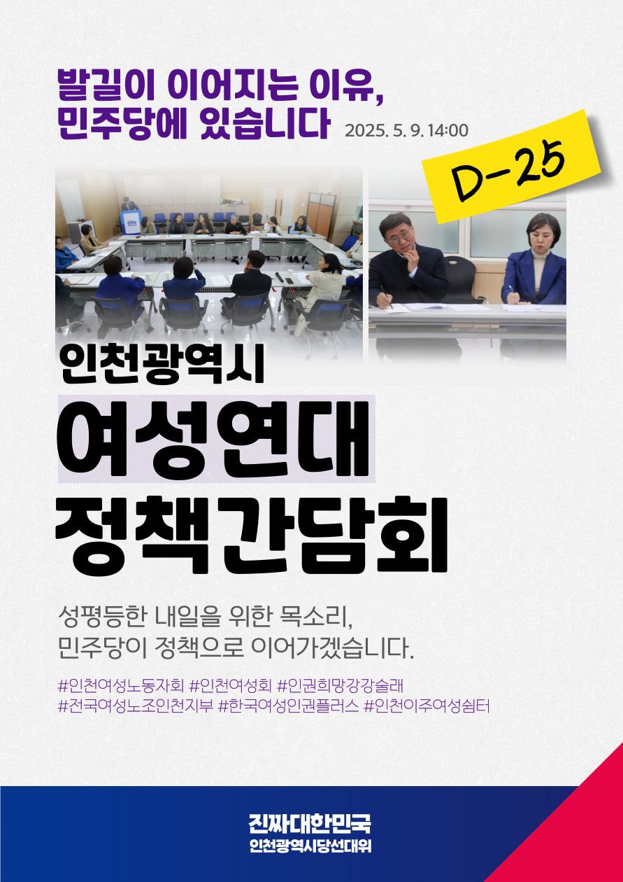 이 자리에서는 성평등, 돌봄, 성범죄 대응 강화 등 다양한 정책 과제가 논의됐다. 간담회에는 남영희 여성희망본부장을 비롯해 박명숙 인천여성노동자회 회장, 손보경 인천여성회 회장, 이정은 인권희망강강술래 대표, 이학금 전국여성노조 인천지부 지부장, 김성미경 한국여성인권플러스 대표, 조세은 이주여성쉼터 소장이 함께했다.