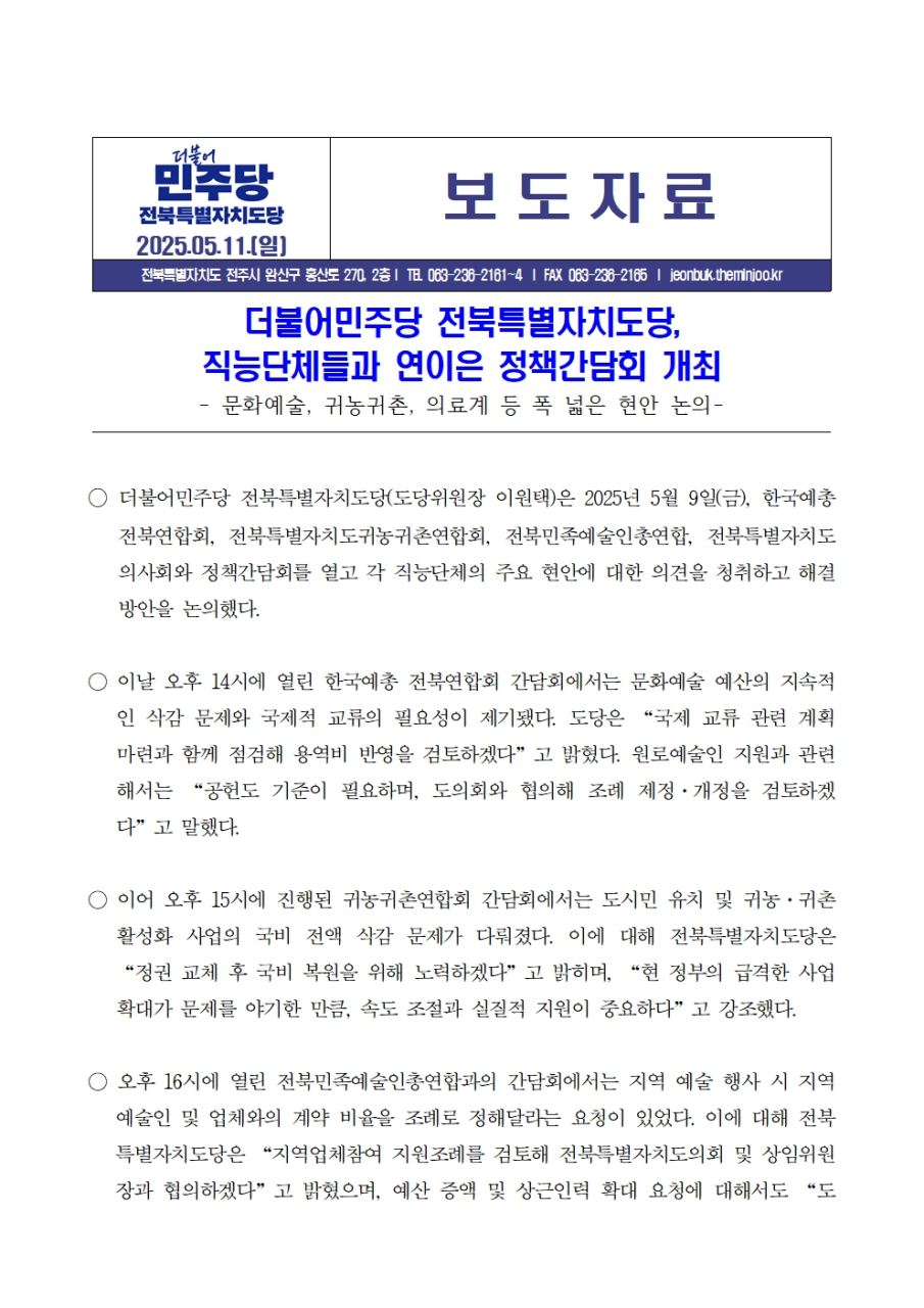 250511_보도자료_전북도당_직능단체_정책간담회 개최_v1.hwp자료사진1_한국예총_전북연합회_간담회.jpg자료사진2_귀농귀촌협의회_간담회.jpg자료사진3_민족예술인총연합_간담회.jpg자료사진4_전북특별자치도의사회_간담회.jpg