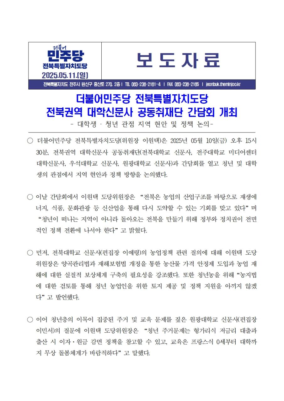일, 2025/05/11- 00:00 에 admin 에 의해 제출됨 [0] 관련 개인/그룹 민주당 전북도당 정당 더불어민주당 지역 전북 카테고리 보도자료 250511_보도자료_전북도당_대학신문사 공동취재단_간담회 개최_v1.hwp자료사진1_전북권역대학신문사_취재단 간담회.jpg자료사진2_전북권역대학신문사_취재단 간담회.jpg 링크 https://jeonbuk.theminjoo.kr/party/sub/news/view.php?brd=249&post=1725&board_id=press Like 0 Dislike 0 댓글 달기 이름 제목 Comment 저장 Preview