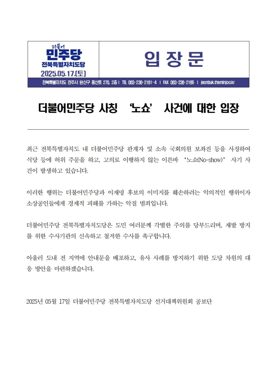 토, 2025/05/17- 00:00 에 admin 에 의해 제출됨 [0] 관련 개인/그룹 민주당 전북도당 정당 더불어민주당 지역 전북 카테고리 보도자료·성명·논평 250517_노쇼사건에_대한_입장_v4.0.hwp 링크 https://jeonbuk.theminjoo.kr/party/sub/news/view.php?brd=60&post=1745&board_id=briefing Like 0 Dislike 0 4 views 댓글 달기 이름 제목 Comment 저장 Preview