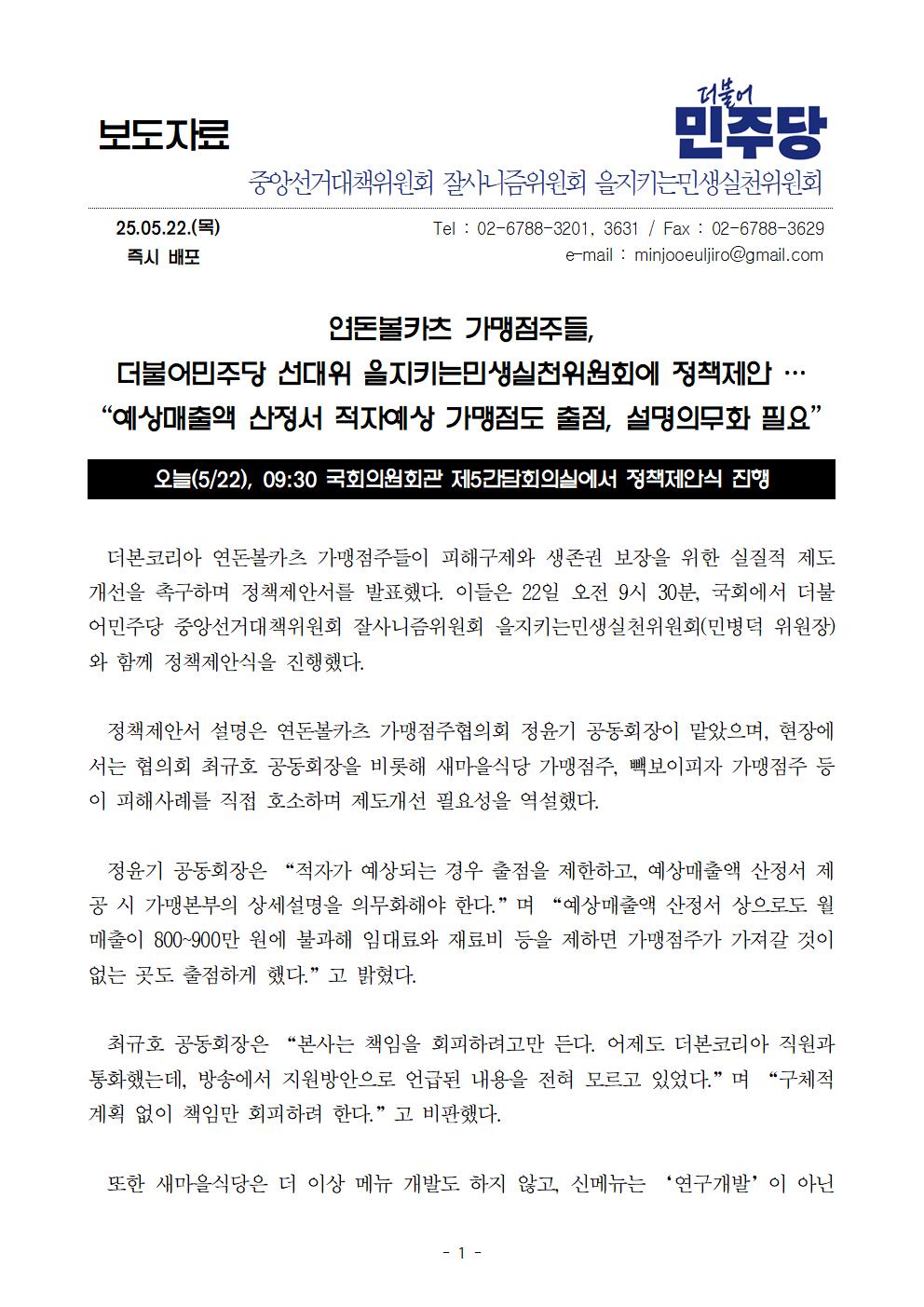 목, 2025/05/22- 00:00 에 admin 에 의해 제출됨 [0] 관련 개인/그룹 민주당 중앙당 정당 더불어민주당 지역 미특정 카테고리 보도자료 250522_보도자료_선대위_을지키는민생실천위원회_연돈볼카츠_점주협의회_정책제안_fn.pdf공유 공유하기 닫기페이스북트위터카카오톡URL 복사 링크 https://theminjoo.kr/main/sub/news/view.php?sno=0&brd=188&post=1211693&search= Like 0 Dislike 0 댓글 달기 이름 제목 Comment 저장 Preview