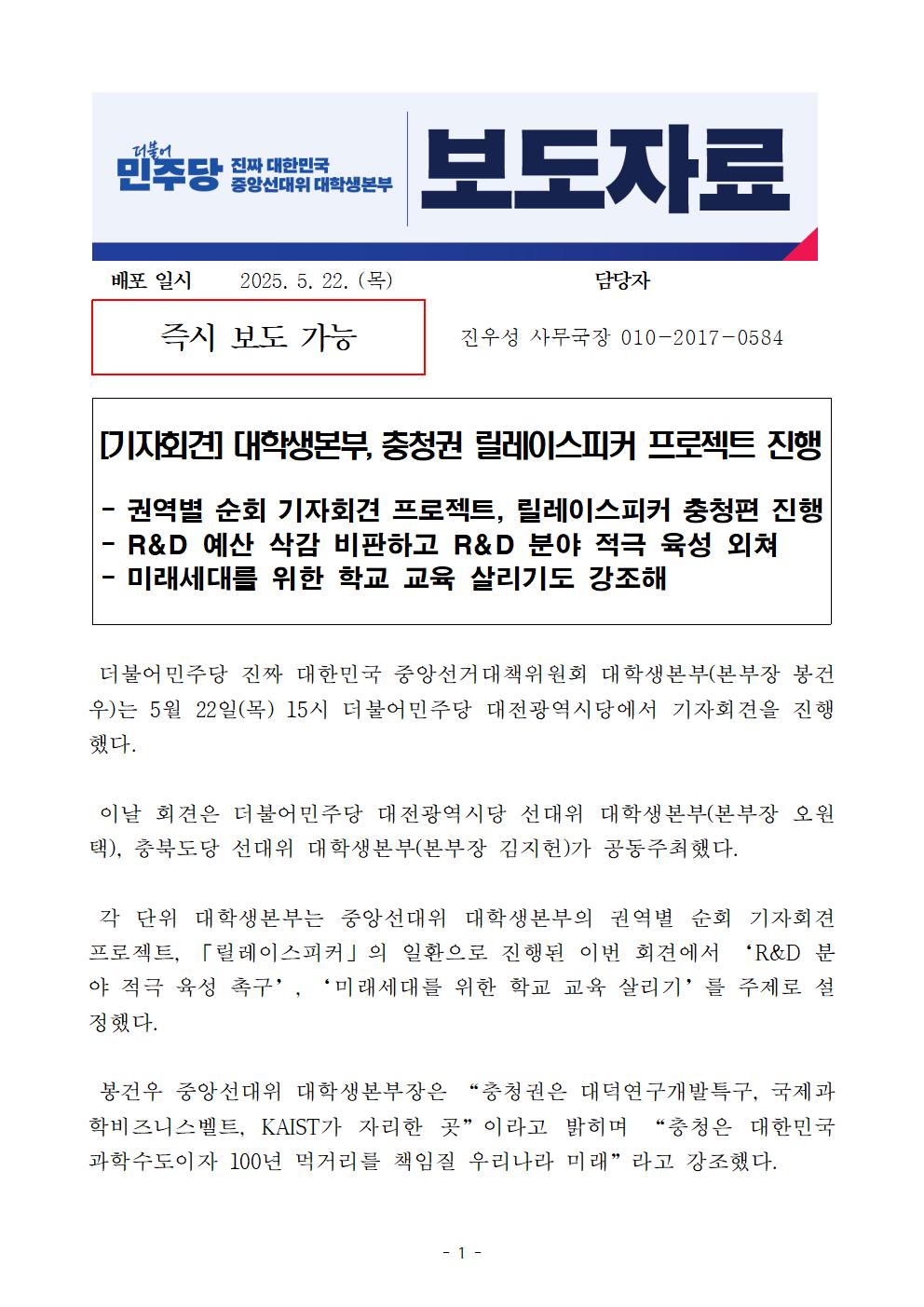 목, 2025/05/22- 00:00 에 admin 에 의해 제출됨 [0] 관련 개인/그룹 민주당 중앙당 정당 더불어민주당 지역 미특정 카테고리 보도자료 250522_대학생본부_보도자료_충청권_릴레이스피커_프로젝트.pdf공유 공유하기 닫기페이스북트위터카카오톡URL 복사 링크 https://theminjoo.kr/main/sub/news/view.php?sno=0&brd=188&post=1211701&search= Like 0 Dislike 0 2 views 댓글 달기 이름 제목 Comment 저장 Preview
