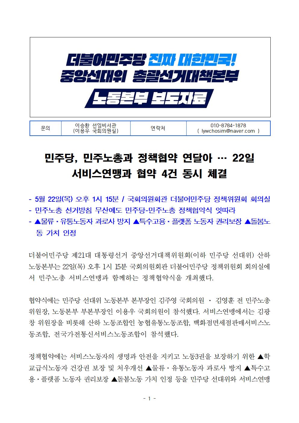 금, 2025/05/23- 00:00 에 admin 에 의해 제출됨 [0] 관련 개인/그룹 민주당 중앙당 정당 더불어민주당 지역 미특정 카테고리 보도자료 보도자료250522_민주당_민주노총서비스연맹_정책협약식_2.pdf공유 공유하기 닫기페이스북트위터카카오톡URL 복사 링크 https://theminjoo.kr/main/sub/news/view.php?sno=0&brd=188&post=1211734&search= Like 0 Dislike 0 댓글 달기 이름 제목 Comment 저장 Preview