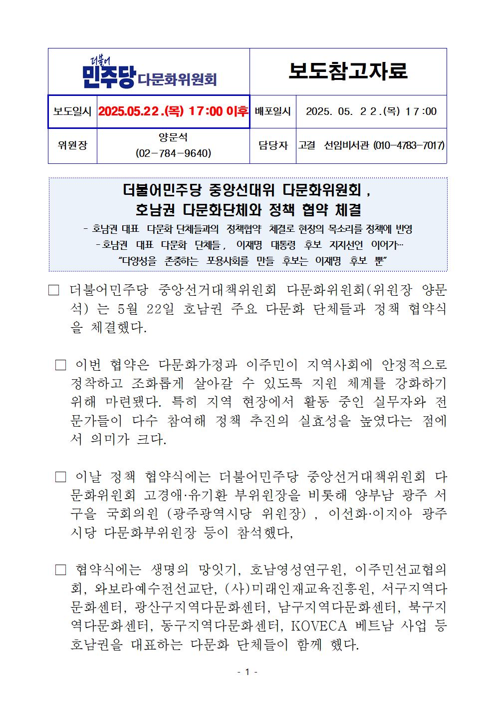 금, 2025/05/23- 00:00 에 admin 에 의해 제출됨 [0] 관련 개인/그룹 민주당 중앙당 정당 더불어민주당 지역 미특정 카테고리 보도자료 250522_더불어민주당_중앙선대위_다문화위원회_호남권_다문화단체와_정책_협약_체결_수정.pdf공유 공유하기 닫기페이스북트위터카카오톡URL 복사 링크 https://theminjoo.kr/main/sub/news/view.php?sno=0&brd=188&post=1211735&search= Like 0 Dislike 0 댓글 달기 이름 제목 Comment 저장 Preview