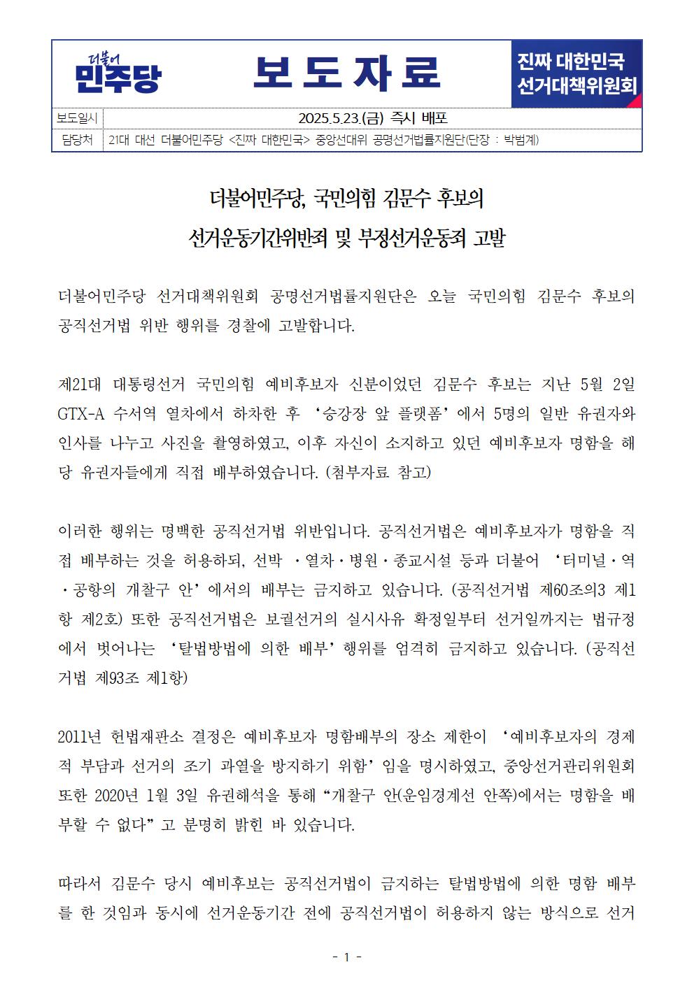금, 2025/05/23- 00:00 에 admin 에 의해 제출됨 [0] 관련 개인/그룹 민주당 중앙당 정당 더불어민주당 지역 미특정 카테고리 보도자료 250523_보도자료_김문수_후보_부정선거운동개찰구_명함배부_고발.pdf공유 공유하기 닫기페이스북트위터카카오톡URL 복사 링크 https://theminjoo.kr/main/sub/news/view.php?sno=0&brd=188&post=1211740&search= Like 0 Dislike 0 1 view 댓글 달기 이름 제목 Comment 저장 Preview