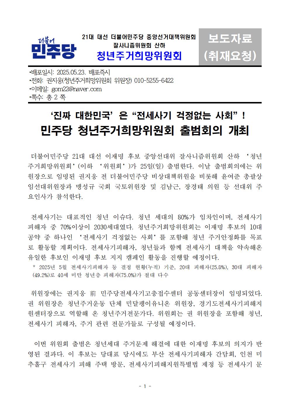 금, 2025/05/23- 00:00 에 admin 에 의해 제출됨 [0] 관련 개인/그룹 민주당 중앙당 정당 더불어민주당 지역 미특정 카테고리 보도자료 250523_청년주거희망위_보도자료_출범회의_개최.pdf공유 공유하기 닫기페이스북트위터카카오톡URL 복사 링크 https://theminjoo.kr/main/sub/news/view.php?sno=0&brd=188&post=1211744&search= Like 0 Dislike 0 댓글 달기 이름 제목 Comment 저장 Preview