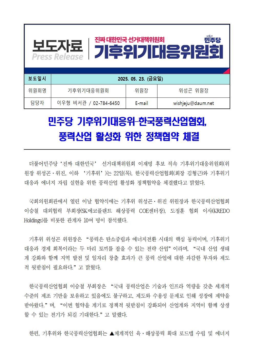 금, 2025/05/23- 00:00 에 admin 에 의해 제출됨 [0] 관련 개인/그룹 민주당 중앙당 정당 더불어민주당 지역 미특정 카테고리 보도자료 250523_기후위기대응위_보도자료_풍력산업_활성화_정책협약.pdf공유 공유하기 닫기페이스북트위터카카오톡URL 복사 링크 https://theminjoo.kr/main/sub/news/view.php?sno=0&brd=188&post=1211752&search= Like 0 Dislike 0 댓글 달기 이름 제목 Comment 저장 Preview
