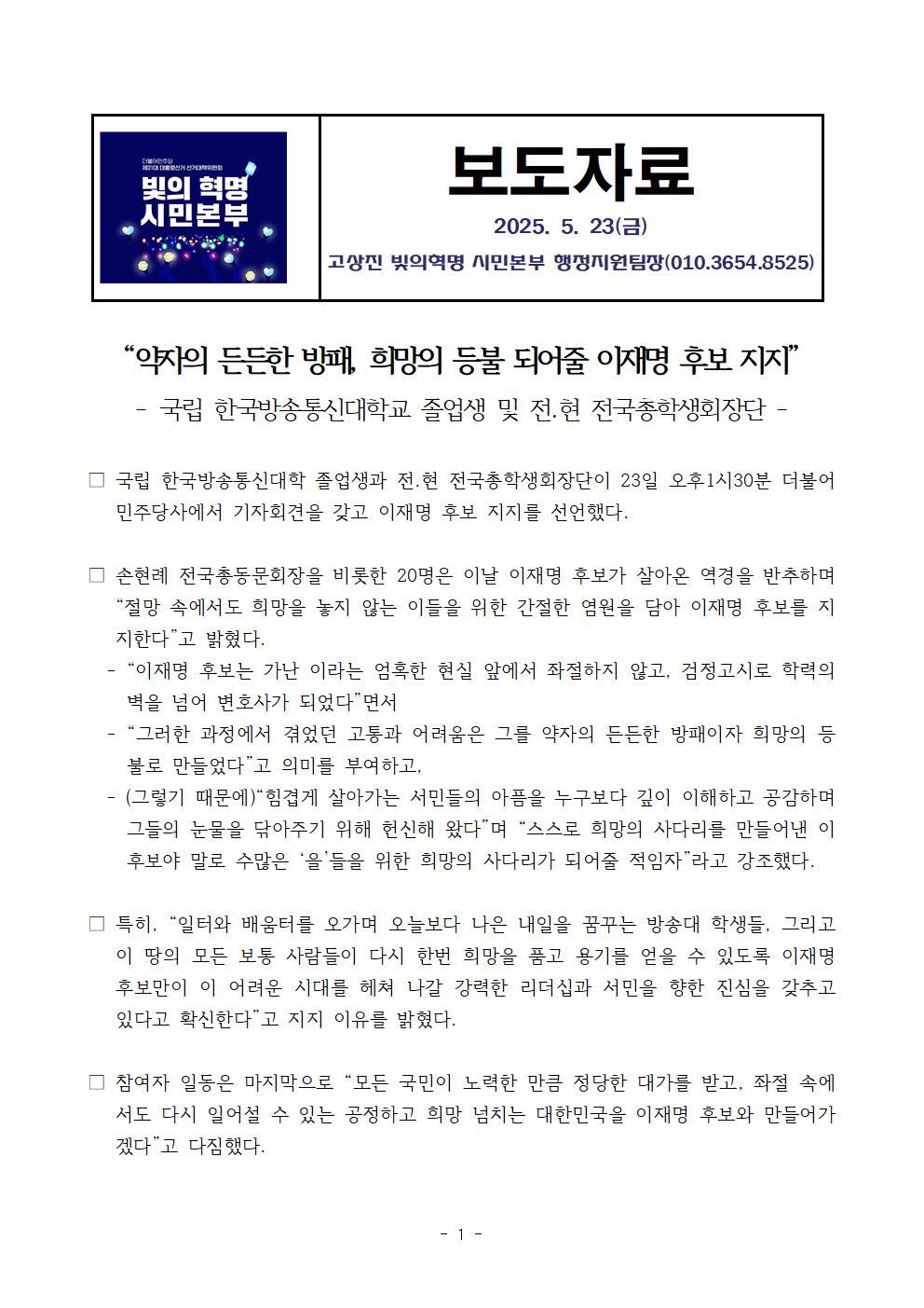 금, 2025/05/23- 00:00 에 admin 에 의해 제출됨 [0] 관련 개인/그룹 민주당 중앙당 정당 더불어민주당 지역 미특정 카테고리 보도자료 250523_빛의혁명시민본부_보도자료_한국방송통신대학교_졸업생_등_지지_선언.pdf공유 공유하기 닫기페이스북트위터카카오톡URL 복사 링크 https://theminjoo.kr/main/sub/news/view.php?sno=0&brd=188&post=1211755&search= Like 0 Dislike 0 댓글 달기 이름 제목 Comment 저장 Preview