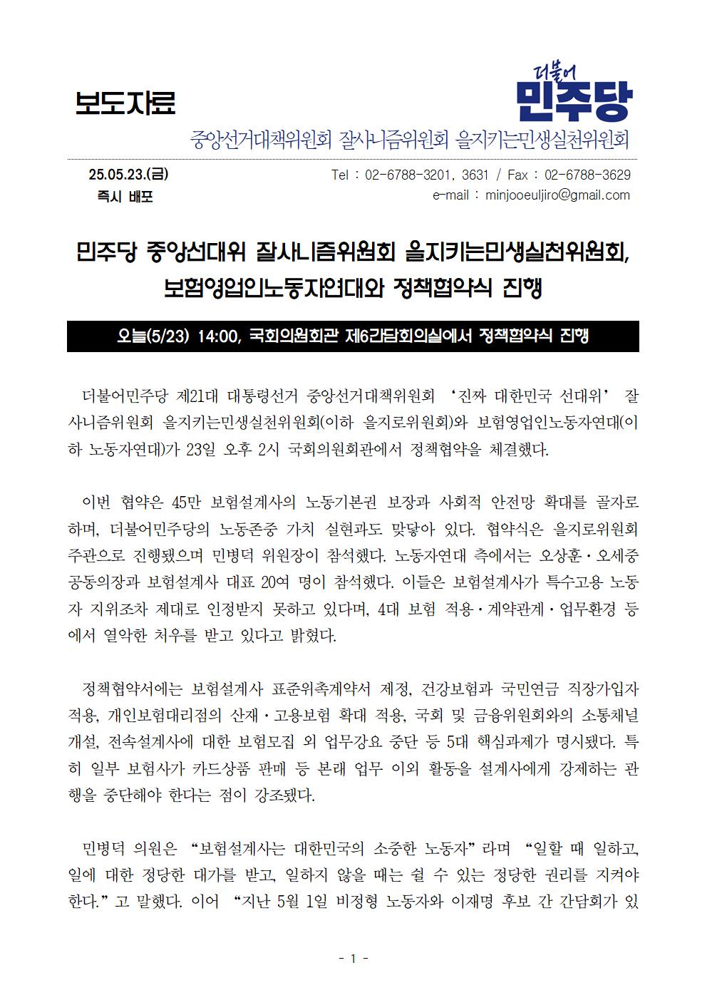 금, 2025/05/23- 00:00 에 admin 에 의해 제출됨 [0] 관련 개인/그룹 민주당 중앙당 정당 더불어민주당 지역 미특정 카테고리 보도자료 250523_을지키는민생실천위_보도자료_보험영업인노동자연대_정책협약식_진행.pdf공유 공유하기 닫기페이스북트위터카카오톡URL 복사 링크 https://theminjoo.kr/main/sub/news/view.php?sno=0&brd=188&post=1211756&search= Like 0 Dislike 0 댓글 달기 이름 제목 Comment 저장 Preview