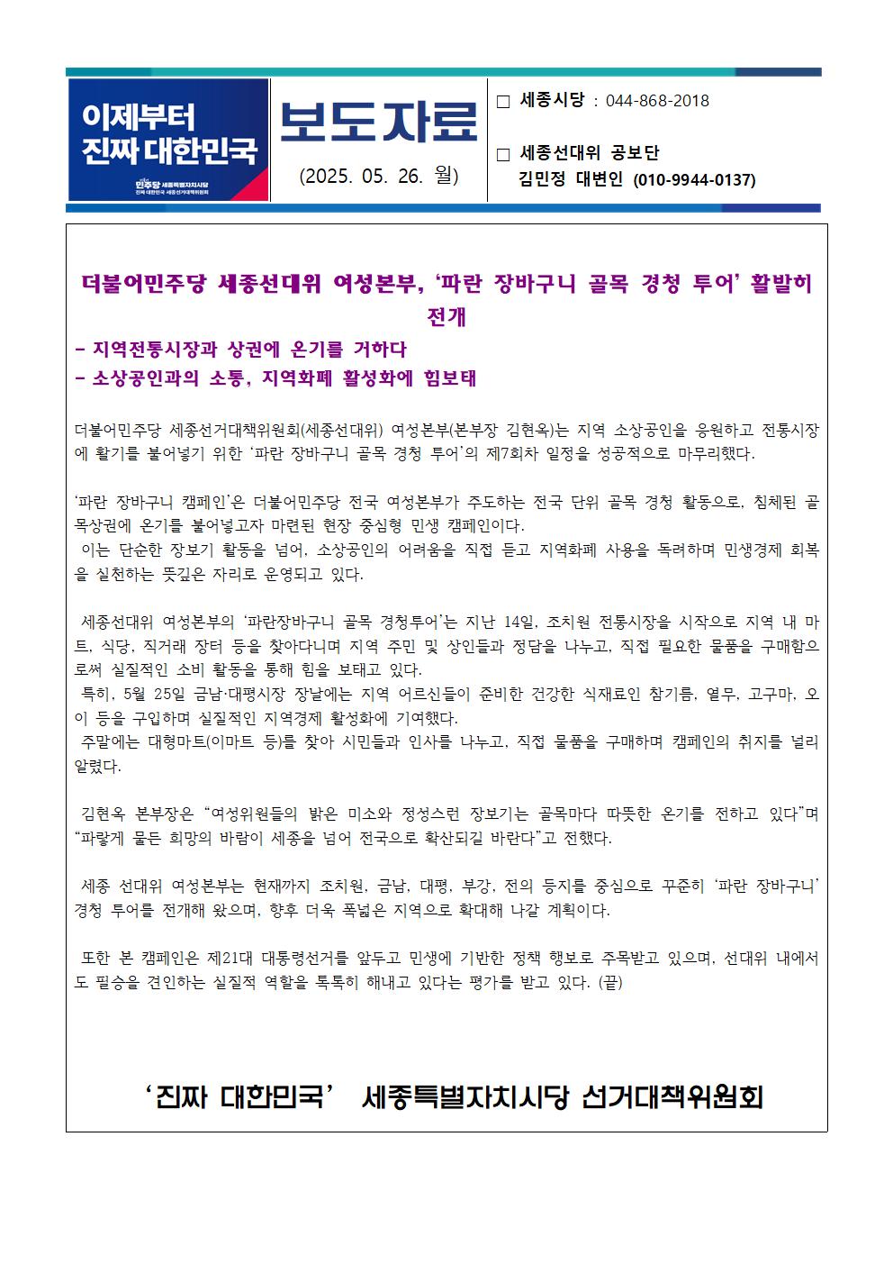 월, 2025/05/26- 00:00 에 admin 에 의해 제출됨 [0] 관련 개인/그룹 민주당 세종시당 정당 더불어민주당 지역 세종 카테고리 보도자료 조치원 시장01.jpg부강장날01.jpg대평장날01.jpg 링크 https://sejong.theminjoo.kr/party/sub/news/view.php?brd=244&post=944&board_id=press Like 0 Dislike 0 댓글 달기 이름 제목 Comment 저장 Preview