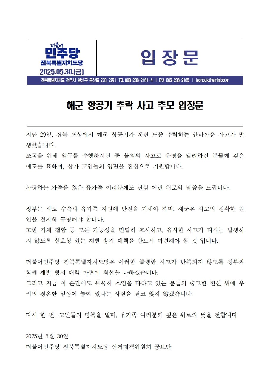 금, 2025/05/30- 00:00 에 admin 에 의해 제출됨 [0] 관련 개인/그룹 민주당 전북도당 정당 더불어민주당 지역 전북 카테고리 보도자료·성명·논평 해군항공기 추락 사고 추모.jpg250530_입장문_해군항공기_추락사고_추모_v1.0.hwp 링크 https://jeonbuk.theminjoo.kr/party/sub/news/view.php?brd=60&post=1838&board_id=briefing Like 0 Dislike 0 댓글 달기 이름 제목 Comment 저장 Preview