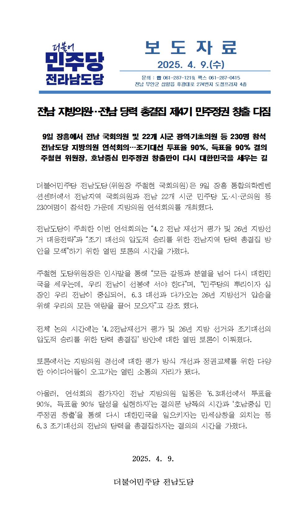 수, 2025/04/09- 00:00 에 admin 에 의해 제출됨 [0] 관련 개인/그룹 민주당 전남도당 정당 더불어민주당 지역 전남 카테고리 보도자료 링크 https://jnminjoo.kr/bbs/?b_id=news_report&site=basic&mn=1018&type=view&bs_idx=544 Like 0 Dislike 0 댓글 달기 이름 제목 Comment 저장 Preview