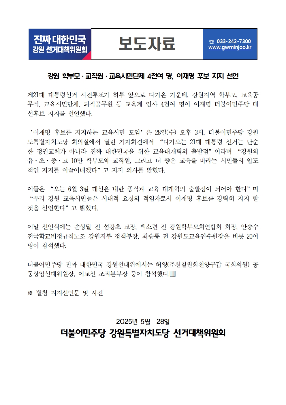 수, 2025/05/28- 00:00 에 admin 에 의해 제출됨 [0] 관련 개인/그룹 민주당 강원도당 정당 더불어민주당 지역 강원 카테고리 보도자료·성명·논평 링크 https://www.gwminjoo.kr/portal/F20000/F20300/boardView?board_key=3338&page=1 Like 0 Dislike 0 댓글 달기 이름 제목 Comment 저장 Preview