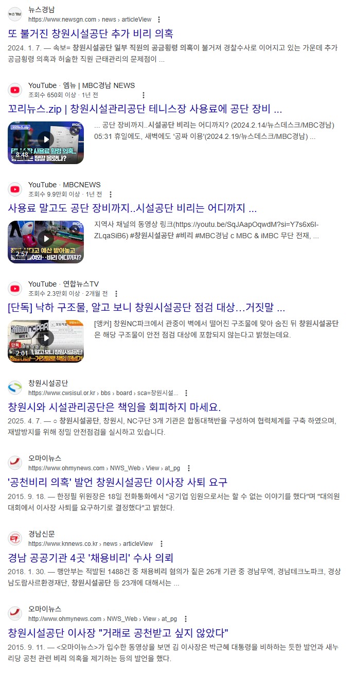 이번 nc야구장 사망에 관해서도 시설공단은 창원시와 함께 아무런 책임을 지지 않고 추모도 하지 않으려 하여 야구팬들과 시민들에게 질타를 받고 있지만 여전히 뻔뻔합니다. 지역사회의 발전을 위해 시설공단이 청렴한 공공기관으로 거듭나길 진심으로 바랍니다.