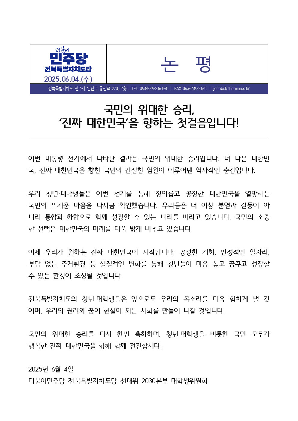 수, 2025/06/04- 00:00 에 admin 에 의해 제출됨 [0] 관련 개인/그룹 민주당 전북도당 정당 더불어민주당 지역 전북 카테고리 보도자료·성명·논평 250604_논평_진짜_대한민국_대학위_v2.0.hwp 링크 https://jeonbuk.theminjoo.kr/party/sub/news/view.php?brd=60&post=1853&board_id=briefing Like 0 Dislike 0 댓글 달기 이름 제목 Comment 저장 Preview