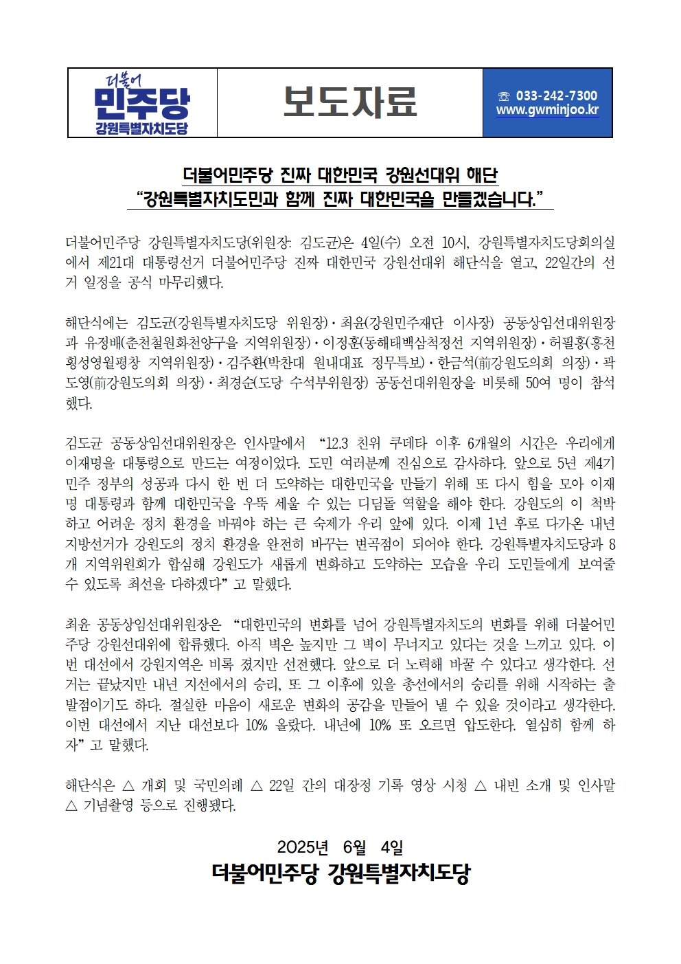 수, 2025/06/04- 00:00 에 admin 에 의해 제출됨 [0] 관련 개인/그룹 민주당 강원도당 정당 더불어민주당 지역 강원 카테고리 보도자료·성명·논평 링크 https://www.gwminjoo.kr/portal/F20000/F20300/boardView?board_key=3360&page=1 Like 0 Dislike 0 댓글 달기 이름 제목 Comment 저장 Preview