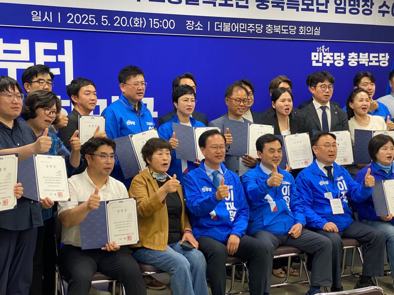 더불어민주당 이재명 대통령 후보 직속 총괄특보단은 5월 20일(화) 오후 3시, 청주시 청원구 율봉로 141 충북도당 회의실에서 ‘충북특보단 임명장 수여식’을 열고 지역본부장 및 부단장단에 대한 공식 임명 절차를 진행했다.