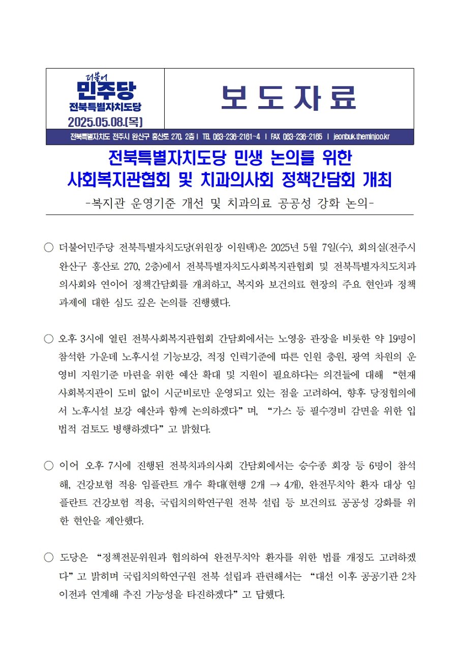 목, 2025/05/08- 00:00 에 admin 에 의해 제출됨 [0] 관련 개인/그룹 민주당 전북도당 정당 더불어민주당 지역 전북 카테고리 보도자료 250508_보도자료_사회복지관협회_및_치과의사회_정책간담회_개최_v2.0.hwp사회복지관협회 간담회1.jpg사회복지관협회 간담회2.jpg치과의사회 간담회1.jpg치과의사회 간담회2.jpg 링크 https://jeonbuk.theminjoo.kr/party/sub/news/view.php?brd=249&post=1704&board_id=press Like 0 Dislike 0 댓글 달기 이름 제목 Comment 저장 Preview