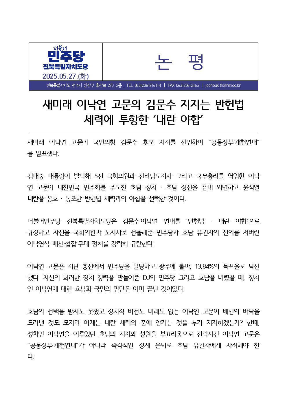 화, 2025/05/27- 00:00 에 admin 에 의해 제출됨 [0] 관련 개인/그룹 민주당 전북도당 정당 더불어민주당 지역 전북 카테고리 보도자료·성명·논평 250527_ [논평]새미래__이낙연_고문_김문수_후보_지지 관련_v1.0.hwp 링크 https://jeonbuk.theminjoo.kr/party/sub/news/view.php?brd=60&post=1821&board_id=briefing Like 0 Dislike 0 댓글 달기 이름 제목 Comment 저장 Preview