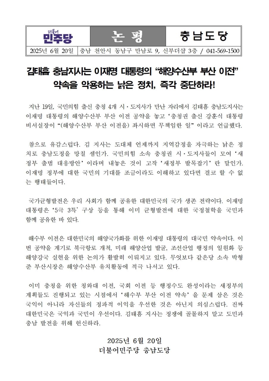 토, 2025/06/21- 00:00 에 admin 에 의해 제출됨 [0] 관련 개인/그룹 민주당 충남도당 정당 더불어민주당 지역 충남 카테고리 보도자료·성명·논평 링크 https://chungnam.theminjoo.kr/party/sub/news/view.php?brd=56&post=958&board_id=briefing Like 0 Dislike 0 댓글 달기 이름 제목 Comment 저장 Preview