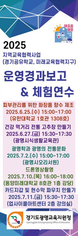 광명교육지원청(교육장 이용현)은 지역사회와 협력하여 경기공유학교 및 미래교육협력지구를 운영하며, 초·중·고 교사를 대상으로 운영 경과 보고회 및 다채로운 체험 연수를 개최한다. 이번 행사는 경기공유학교 및 미래교육협력지구의 성공적인 운영 사례를 공유하고, 지역사회와 함께하는 미래 교육을 위한 교사들의 역량 강화를 위해 마련되었다.운영 경과 보고회에서는 광명교육지원청 경기공유학교 및 미래교육협력지구 사업으로 추진해온 다양한 프로그램의 성과와 운영사례를 공유한다. 광명지역의 교육 자원을 활용한 특색 있는 교육 모델을 제시하고, 학생들에