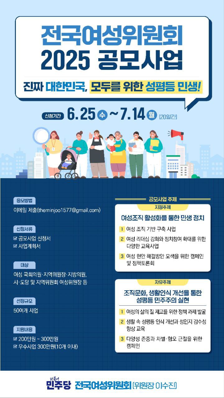 금, 2025/06/27- 00:00 에 admin 에 의해 제출됨 [0] 관련 개인/그룹 민주당 충북도당 정당 더불어민주당 지역 충북 카테고리 공지사항 When 2025-07-14 링크 https://chungbuk.theminjoo.kr/party/sub/news/view.php?brd=109&post=2681&board_id=notice Tags 민주당 전국여성위원회 여성 여성 정책 Like 1 Dislike 0 30 views 댓글 달기 이름 제목 Comment 저장 Preview