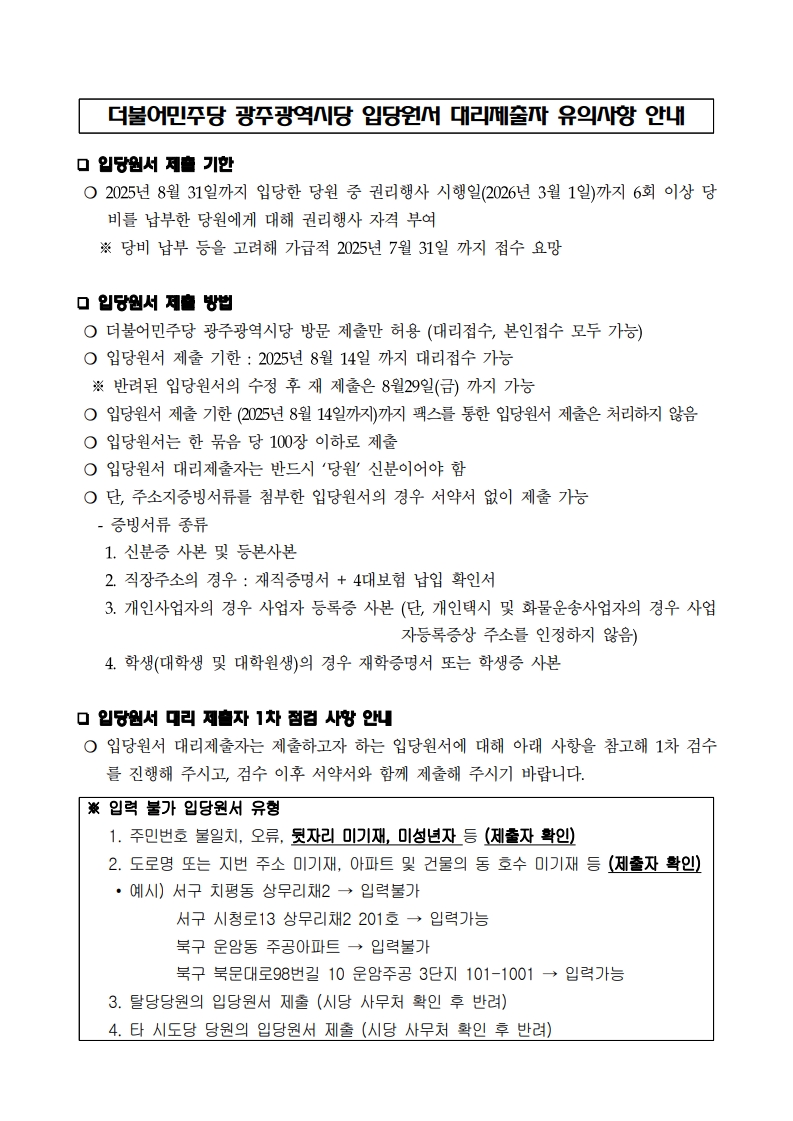 월, 2025/06/30- 00:00 에 admin 에 의해 제출됨 [0] 관련 개인/그룹 민주당 광주시당 정당 더불어민주당 지역 광주 카테고리 공지사항 250623_입당원서 대리제출자 안내문.hwp 링크 https://gwangju.theminjoo.kr/party/sub/news/view.php?brd=110&post=716&board_id=notice Like 0 Dislike 0 댓글 달기 이름 제목 Comment 저장 Preview