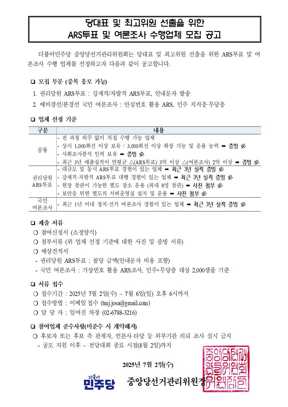 수, 2025/07/02- 00:00 에 admin 에 의해 제출됨 [0] 관련 개인/그룹 민주당 중앙당 정당 더불어민주당 지역 미특정 카테고리 공지사항 (첨부) ARS투표_및_여론조사_수행업체_참여신청서.hwp공유 공유하기 닫기페이스북트위터카카오톡URL 복사 링크 https://theminjoo.kr/main/sub/news/view.php?sno=0&brd=1&post=1212640&search= Like 0 Dislike 0 3 views 댓글 달기 이름 제목 Comment 저장 Preview
